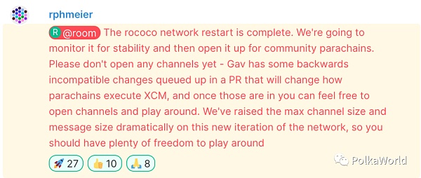 Después de una ronda de pruebas de función de subastas y préstamos colectivos, la red Rococo ha completado otra corrección de errores y actualización, y ahora se ha reiniciado con éxito. Parity está monitoreando su estabilidad antes de abrir el registro de parachain a la comunidad. Gavin está trabajando en algunos cambios incompatibles que cambiarán la forma en que las paracaídas implementan XCM y, una vez hecho esto, siéntete libre de abrir canales y jugar. En la nueva versión de esta actualización, el tamaño del mensaje de cadena cruzada máxima se ha incrementado considerablemente, por lo que todos tendrán suficiente libertad para probar esta vez.
