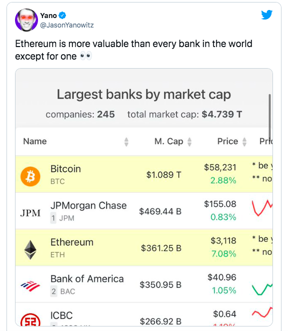 El cofundador de Blockworks, Jason Yanowitz, señaló que la capitalización de mercado de Ethereum ahora es más alta que la de todos los bancos del mundo, excepto JPMorgan Chase.