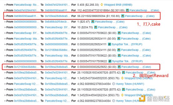El hacker primero inyectó 56 tokens de pastel en el contrato de cuteMinter; luego, al mismo tiempo, llamó a la función getReward en el contrato CakeFilpValut, lo que activó indirectamente la función mintFor en cuteMinter.