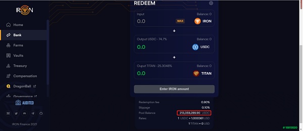 A partir de las 8:00 de hoy, Iron Finance tiene USD 213 millones en USDC como garantía. El anuncio oficial dijo que tomará 12 horas (alrededor de las 9:00 de esta noche) para el bloqueo de tiempo antes de que los usuarios puedan canjear USDC nuevamente. Además, IRON Finance recuerda a la comunidad que retire liquidez de todos los fondos y publicará un informe de análisis posterior al evento lo antes posible. En la actualidad, el monto total bloqueado de IRON Finance es de solo 259 millones de dólares estadounidenses, que es aproximadamente un 90% inferior al punto máximo de ayer.