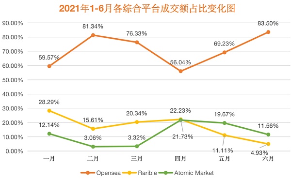 Desde la perspectiva de los cambios en la cuota de mercado, la cuota de mercado de Rarible, que ocupó el segundo lugar, cayó del 18,18 % al 12,41 %, mientras que la cuota de mercado de Atomic Market aumentó del 6,57 % al 14,9 %, casi duplicando el crecimiento. ., la proporción antes de abril siempre fue menor que la de Opensea y Rarible, pero después de abril, la proporción de facturación superó a Rarible durante tres meses consecutivos, ocupando el segundo lugar, mientras que Opense, que ocupó el primer lugar, subió desde enero de principios de año. La cuota de mercado del 59,57 % aumentó al 83,5 % en junio, un aumento de casi el 30 %, ubicándose firmemente en el primer lugar en las ventas de plataformas comerciales integrales.