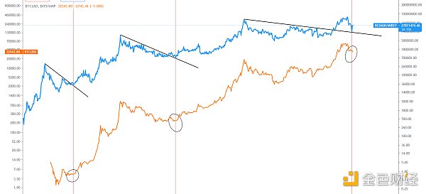 En comparación, se puede encontrar que ha habido muchos procesos de este tipo en la etapa inicial de la historia.Después de que los ingresos del minero rompen la línea de tendencia descendente del pico anterior, hay una acción de dar un paso atrás para confirmar. subir una cierta distancia y luego retroceder bruscamente es un avance y un retroceso. Si no se abre paso, es una tendencia saludable. Luego, los ingresos de los mineros fluctuarán y se recuperarán para comenzar un nuevo viaje. Se puede encontrar que el precio de BTC en ese momento correspondiente al retroceso en la línea de tendencia está en un punto bajo por etapas, seguido de una gran ola de olas ascendentes, por lo que el ajuste de los ingresos de los mineros en cambio brinda una oportunidad de compra baja. para el pozo de oro BTC.
