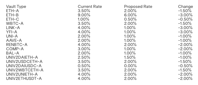 El proyecto de préstamos líder MakerDAO lanzó una propuesta de gobernanza para votar una nueva propuesta hace unos días, con el objetivo de reducir aún más la tasa de estabilidad de las bóvedas de protocolo (la llamada tasa estable se refiere a los usuarios de Maker que depositan garantías para generar la tasa de interés). que DAI tiene que pagar). De los detalles de la propuesta, se puede ver que la tarifa estable de cada bóveda enfrentará una reducción de diversos grados.