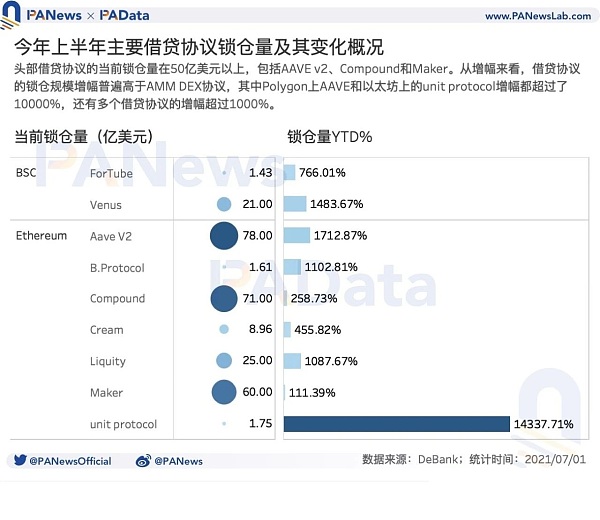 A juzgar por la tasa de crecimiento del monto bloqueado del acuerdo de préstamo, en la primera mitad del año, el AAVE en Polygon y el protocolo Unit en Ethereum aumentaron significativamente. Hay múltiples protocolos de préstamo que han experimentado aumentos de más del 1000%. , incluidos AAVE V2 (Ethereum), Venus, B.Protocol y Liquity. De la situación general, la tasa de crecimiento de la escala de bloqueo de los acuerdos de préstamo es generalmente más alta que la de AMM DEX.