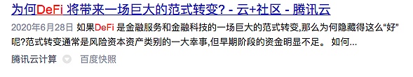 Coloque el tiempo entre junio y julio de 2020 y haga clic en la entrada DeFi. El tema ubicado en la parte superior de la lista de búsqueda se centra en "qué es exactamente DeFi". En este momento, se puede encontrar que las personas están ansiosas por comprender el contenido científico popular sobre DeFi, y el índice de búsqueda de DeFi de Baidu ha aumentado considerablemente. . En ese momento, la definición de DeFi era un negocio financiero con el tema de la moneda digital en el que uno mismo dominaba la clave privada. Pero esta definición es todavía un poco delgada. A través del fenómeno, la curiosidad de las personas sobre DeFi no radica en el contenido en sí, porque ya no es un tema nuevo, sino en cuál es el código de riqueza detrás del aumento vertiginoso. Las personas están muy ansiosas por ingresar al mercado temprano en el auge para compartir el dividendos