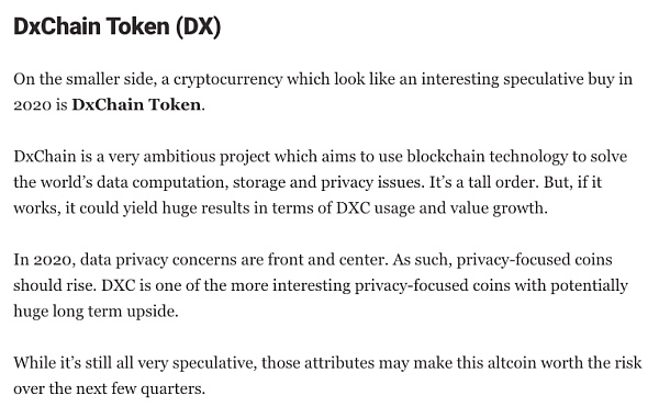 Los problemas de privacidad de datos se convertirán en una prioridad principal en 2020. Después de los problemas de privacidad de datos que surgieron sucesivamente en los últimos dos años, todos han prestado una atención sin precedentes a los problemas de seguridad y privacidad de datos, y los proyectos de privacidad de datos aumentarán. Como uno de los primeros proyectos que utiliza la tecnología blockchain para estudiar el almacenamiento y la seguridad de los datos, DX es uno de los tokens centrados en la privacidad y la seguridad de los datos, y tiene un enorme potencial de crecimiento a largo plazo. Si bien la compra de DX en este momento es altamente especulativa, en los próximos trimestres, estos elementos serán la clave para obtener un retorno proporcional de su inversión.