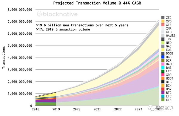 A este ritmo, Ethereum y Bitcoin, y quizás EOS, cruzarán el umbral de los mil millones de transacciones por año en 2023. Sin embargo, sugiero que tomemos esta predicción con cautela, ya que nuestro futuro no seguirá la predicción del crecimiento lineal, sin mencionar las limitaciones prácticas como el tamaño del bloque, etc. (Blue Fox Notes: hay muchas posibilidades en 3 años, incluidos los avances tecnológicos no lineales)