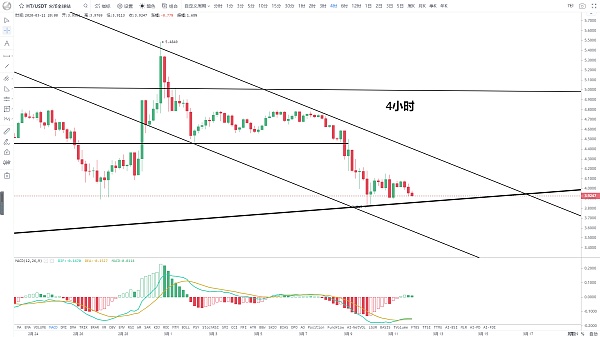 La línea diaria en su conjunto se encuentra en el canal de tendencia bajista que tocó $ 5,5 en la etapa inicial. Solo un gran avance puede revertir la tendencia débil. En la actualidad, el precio ha dejado de caer en el nivel de soporte de Fibonacci 78,6% desde el punto más alto. . El mercado está subiendo y es poco probable que vuelva a caer bruscamente en el corto plazo. La probabilidad de mantener una consolidación de rango y esperar a que el promedio móvil se mueva hacia abajo es alta. También hay una tendencia de desviación inferior en 4 horas Si puede alcanzar un nuevo mínimo en el futuro y el volumen puede cooperar, se espera que se recupere a 3,4 dólares.