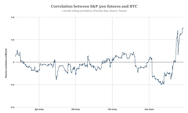 Sin embargo, según un informe de análisis relacionado, la correlación entre Bitcoin y el S & P 500, medida por la correlación entre los rendimientos por hora y BTC/USD en Coinbase, alcanzó un punto máximo en marzo durante la nueva crisis epidémica del corona virus. del año.