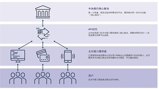 Sin embargo, se puede ver en el informe "Moneda digital del banco central: oportunidades, desafíos y diseños" que el modelo del Banco de Inglaterra es que el banco central crea el libro principal y luego abre el acoplamiento API a cualquier institución privada con acceso a desarrollar aplicaciones y proporcionar servicios de pago a los usuarios. Los usuarios usan CBDC directamente y el banco central lleva toda la contabilidad. - Esta es en realidad una estructura de una sola capa.