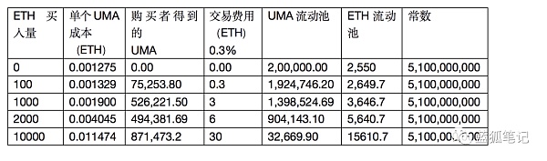 También vale la pena señalar que bajo este mecanismo de creación de mercado de Uniswap, básicamente no hay ruptura. De la tabla anterior, podemos ver que su tasa de cambio mínima es 1UMA=0.001275, esto se debe a que la circulación total es de solo 2 millones de UMA, y su modo de producto constante hace que no sea inferior a la tasa de cambio inicial. En este sentido, es de hecho muy beneficioso para las partes del proyecto que emiten a través de IUO, y también es muy beneficioso para los pocos participantes que pueden obtener las primeras transacciones.