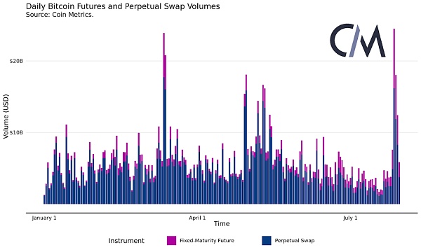 Los contratos perpetuos, popularizados por BitMEX en el ecosistema criptográfico, son raros en los mercados financieros tradicionales. Los contratos perpetuos representan una gran parte del volumen de negociación de derivados, eclipsando el volumen de negociación de futuros a plazo fijo en los intercambios rastreados por Coin Metrics.