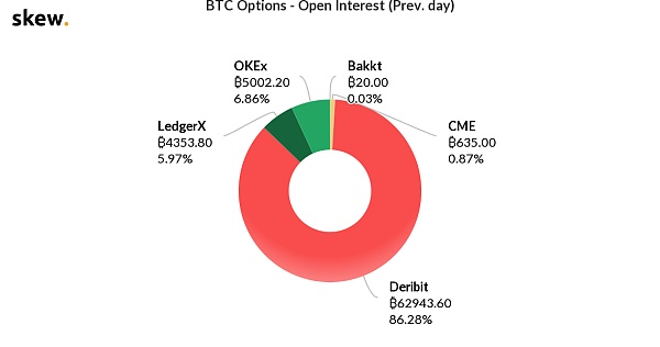 Aunque CME, Bakkt y LedgerX ingresaron al mercado de futuros de Bitcoin como representantes de intercambios regulados, según datos de Skew (Nota: Skew es un término de opción), un proveedor de servicios de datos de derivados de criptomonedas, la gran mayoría de las transacciones en las opciones de Bitcoin mercado El volumen no proviene de ellos, sino de Deribit y OKEx.