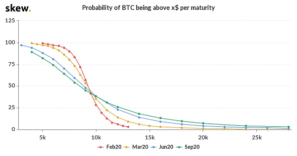 La imagen de arriba muestra la probabilidad de un precio de bitcoin superior a cierto. Los inversores son más optimistas sobre el precio de bitcoin en 2020, y sus expectativas sobre el aumento del precio de bitcoin en septiembre, junio y marzo de 2020 están aumentando.