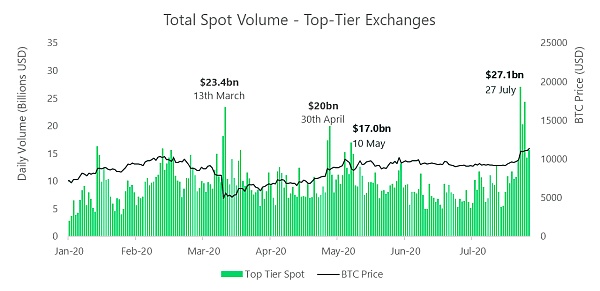 XRP/USD-2.16%Desde el 1 de julio, el precio de Bitcoin (BTC) ha subido de $9,088 a $11,800, un aumento de más del 30%. Los volúmenes de negociación en los principales intercambios de criptomonedas aumentaron a la asombrosa cifra de $ 334 mil millones.