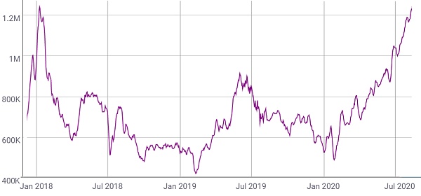 Como muestra el gráfico a continuación, el volumen de transacciones se ha duplicado en los últimos seis meses a 1,23 millones de transacciones por día.