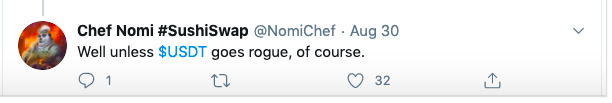 El 30 de agosto, el funcionario del proyecto SushiSwap, @Chef Nomi, tuiteó que un usuario transfirió 400 000 USDT a su dirección de contrato inteligente Token (SUSH). Además, el equipo de SushiSwap declaró que los tokens transferidos al contrato inteligente no podrán retirarse.