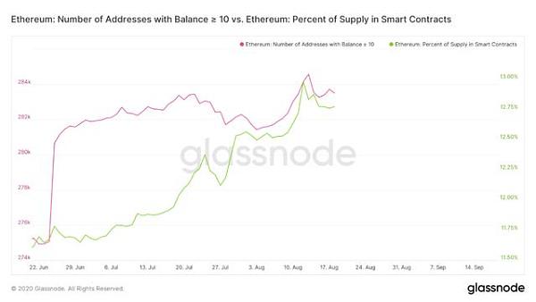 De hecho, es interesante notar que las direcciones de Ethereum con un saldo superior a 10 también experimentaron un aumento significativo en el mismo período de tiempo. Solo en los últimos tres meses, dichas direcciones han crecido de 275 000 a 283 000, según el proveedor de datos web Glassnode.