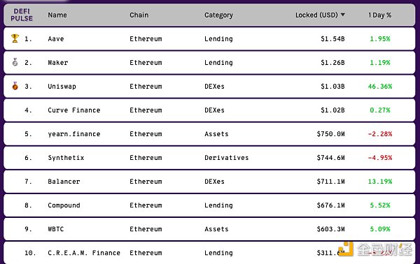 Los 10 principales proyectos DeFi Clasificación de activos bloqueados y volumen bloqueado, fuente de datos: Defi Pulse