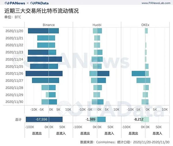 Según las estadísticas de la plataforma de seguimiento de activos CoinHelmes, del 20 al 30 de noviembre, Binance tuvo una entrada total de 50 828 BTC, una salida total de 108 384 BTC y una salida neta total de 57 556 BTC, que fue la salida neta de Bitcoin. activos entre los tres intercambios El más grande es equivalente a una salida neta diaria promedio de 5232 BTC. En segundo lugar, OKEx tuvo una entrada total de 13 691 BTC, una salida total de 21 904 BTC y una salida neta de 8 212 BTC.