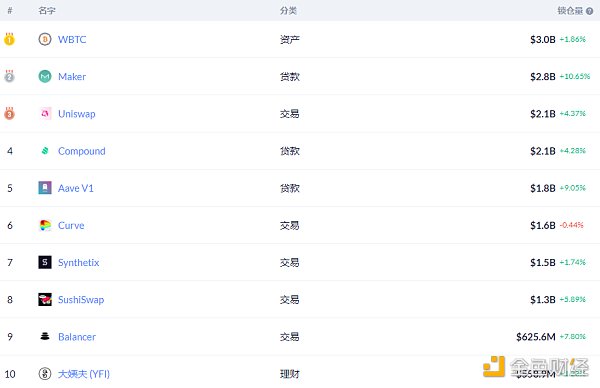 Datos DeFi 1. El valor de mercado total de DeFi: 20,128 mil millones de dólares estadounidenses El auge y la caída de las diez principales monedas por capitalización de mercado, Jinse Finance Chart.