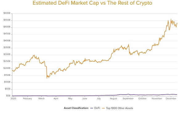DeFi es la niña mimada del mundo de las criptomonedas, así como la niña mimada de los desarrolladores. Muchos de los proyectos más valiosos lanzados este año provienen de DeFi. Aún así, su tamaño es pequeño, alrededor del 2% de la capitalización de mercado estimada de otras criptomonedas. En nuestra opinión, esta es una buena noticia para DeFi. Con base en su valor de mercado general actual, está recibiendo más atención de la que merece, pero creemos que la razón de la mayor atención pública, con muchos tecnólogos entusiasmados con el potencial de esta área de crecimiento, es una señal positiva de su progreso.