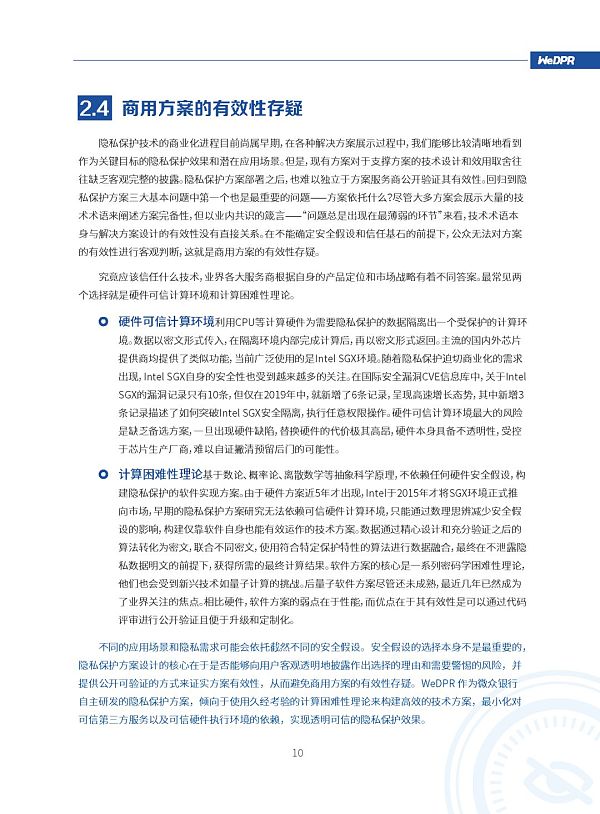 Para superar estas dificultades, el equipo de blockchain de WeBank desarrolló de forma independiente la solución de protección de privacidad WeDPR, basándose en blockchain y otras tecnologías de contabilidad inteligente distribuidas y confiables, e integrando logros de vanguardia en campos profesionales como algoritmos criptográficos, algoritmos de protección de privacidad y seguridad. computación multipartita, teniendo en cuenta la experiencia del usuario y la gobernanza regulatoria, brindando soluciones técnicas extremadamente optimizadas para los escenarios de aplicaciones centrales de protección de la privacidad, al tiempo que logra efectos de protección de la privacidad verificables públicamente.