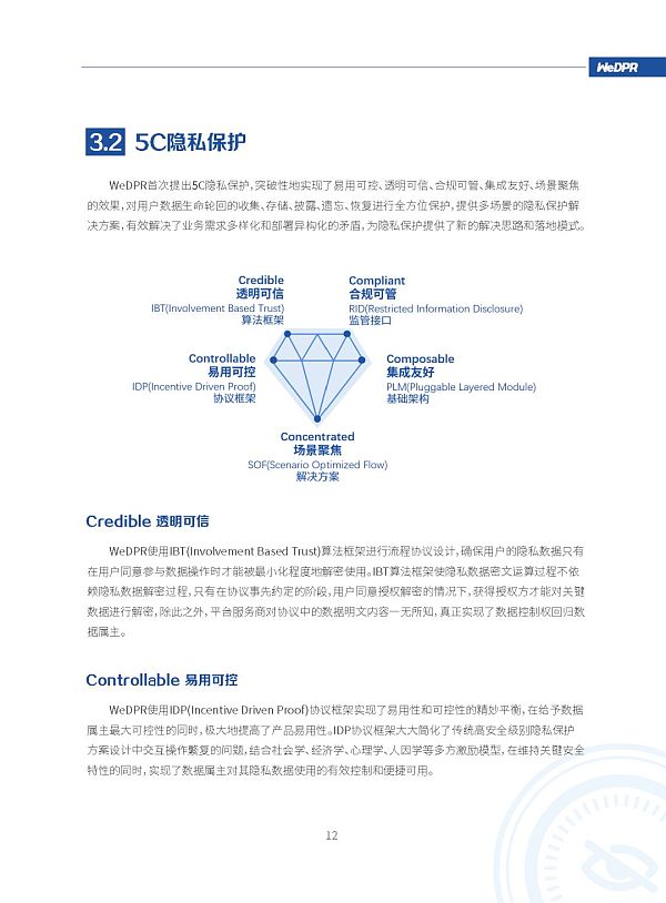 WeDPR presenta de manera innovadora las cuatro características técnicas del marco del algoritmo IBT (Confianza basada en la participación), el marco del protocolo IDP (Prueba impulsada por incentivos), la interfaz regulatoria RID (Divulgación de información restringida) y la infraestructura PLM (Módulo en capas conectable), logrando efectivamente la protección de privacidad 5C efecto, es decir, fácil de usar y controlable (Controllable), transparente y creíble (Credible), compatible y manejable (Compliant), fácil de integrar (Composable) y centrado en la escena (Concentrated).