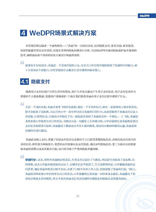 En la actualidad, WeDPR ha tomado el pago oculto, la votación anónima, la subasta anónima y la divulgación selectiva como el primer lote de escenarios de aplicación, proporcionando soluciones específicas. En el futuro, WeDPR se adaptará a escenarios comerciales más diversos, ampliará las necesidades comerciales de protección de la privacidad, permitirá que la privacidad de los datos regrese al propietario, estimulará la innovación comercial de manera legal y compatible, generará comentarios positivos para la transferencia de valor y construirá un ecosistema de datos. balance.