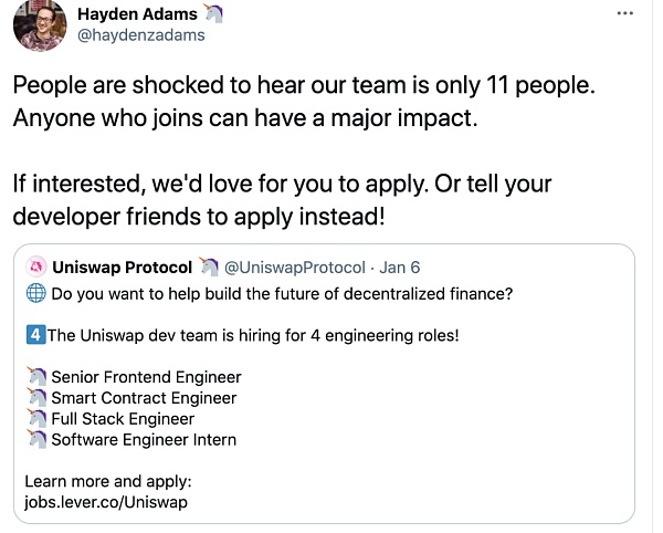 Coinbase tiene 1100 empleados en 2019, y solo hay 100 empleados de cumplimiento ¿Cuántos empleados tiene Uniswap? ¡Solo 11 personas!