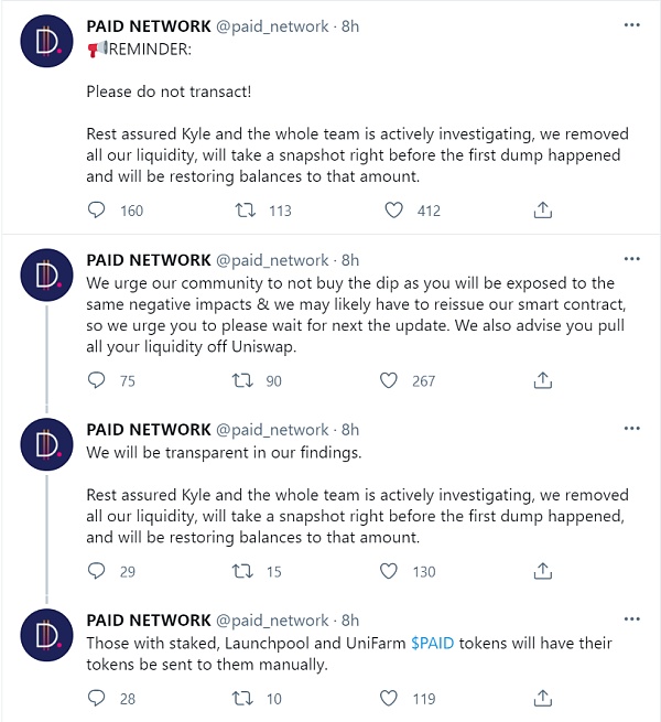 Según las noticias, el proyecto Ethereum DApp Paid Network ha sido atacado. El atacante acuñó casi $160 millones en tokens PAGADOS a través de la vulnerabilidad del contrato y obtuvo una ganancia de 2000 ETH (aproxima.