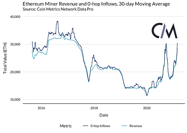 Los depósitos de los mineros en las bolsas se pueden utilizar para medir el volumen de ventas y la posición del minero. Al igual que los mineros de Bitcoin, los mineros de Ethereum generalmente tienden a depositar monedas en Binance y Huobi. Estos grandes mercados asiáticos están bien conectados con los mineros, y las dos bolsas también operan pools de minería.