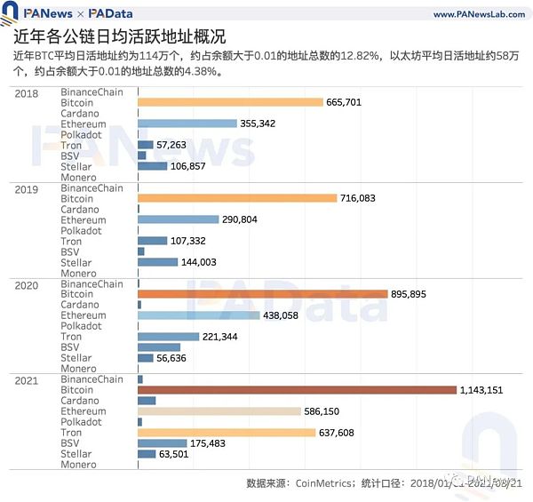 2) La dirección activa diaria promedio de Bitcoin es de aproximadamente 1,14 millones, lo que representa el 12,82 % del número total de direcciones válidas (con un saldo superior a 0,01); la dirección activa diaria promedio de Ethereum es de aproximadamente 580 000, lo que representa el 12,82 % de el total de domicilios válidos (con saldo superior a 0,01) 4,38%. El promedio diario de direcciones activas de otras cadenas públicas está entre 50.000 y 200.000.