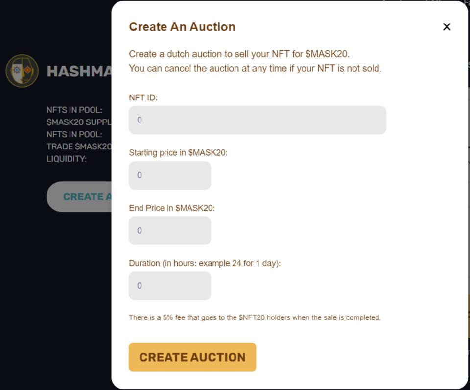 Tengo un Hashmask que funciona. Creo que esta pieza debería tener un precio superior al precio de mercado de 100 MSAK20. Entonces puede iniciarse la subasta holandesa y el precio de esta obra puede determinarse a través del mercado. Si la obra no se vende, puedo cancelar la subasta en cualquier momento.