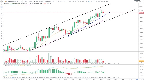 El punto alto reciente se actualizó nuevamente, y el precio siguió probando al alza. El más alto estuvo cerca de la línea de 10,500 dólares estadounidenses. Fue suprimido por la resistencia superior y retrocedió ligeramente. El volumen de negociación aún no era pesado, lo que también era la razón por la cual el corto plazo no pudo continuar con la tendencia alcista. Los indicadores diarios se mantuvieron fuertes, el precio todavía se está moviendo en un canal ascendente. Desde el punto de vista de la tendencia, es obvio que los alcistas tienen la ventaja, y el la tendencia general es una tendencia alcista volátil. La primera zona de resistencia anterior es de alrededor de 11 000 dólares estadounidenses, que es el 61,8 % de los 13 900 dólares estadounidenses anteriores. Sin embargo, la línea horaria actual en la formación de un arreglo en forma de cuña, hay una alta posibilidad de un retroceso a corto plazo. Mientras no se rompa el soporte de la tendencia, el retroceso es una oportunidad para aumentar posiciones y hacer más. Todavía hay espacio en la perspectiva del mercado para apoyar el área de $ 10,000-10,100.